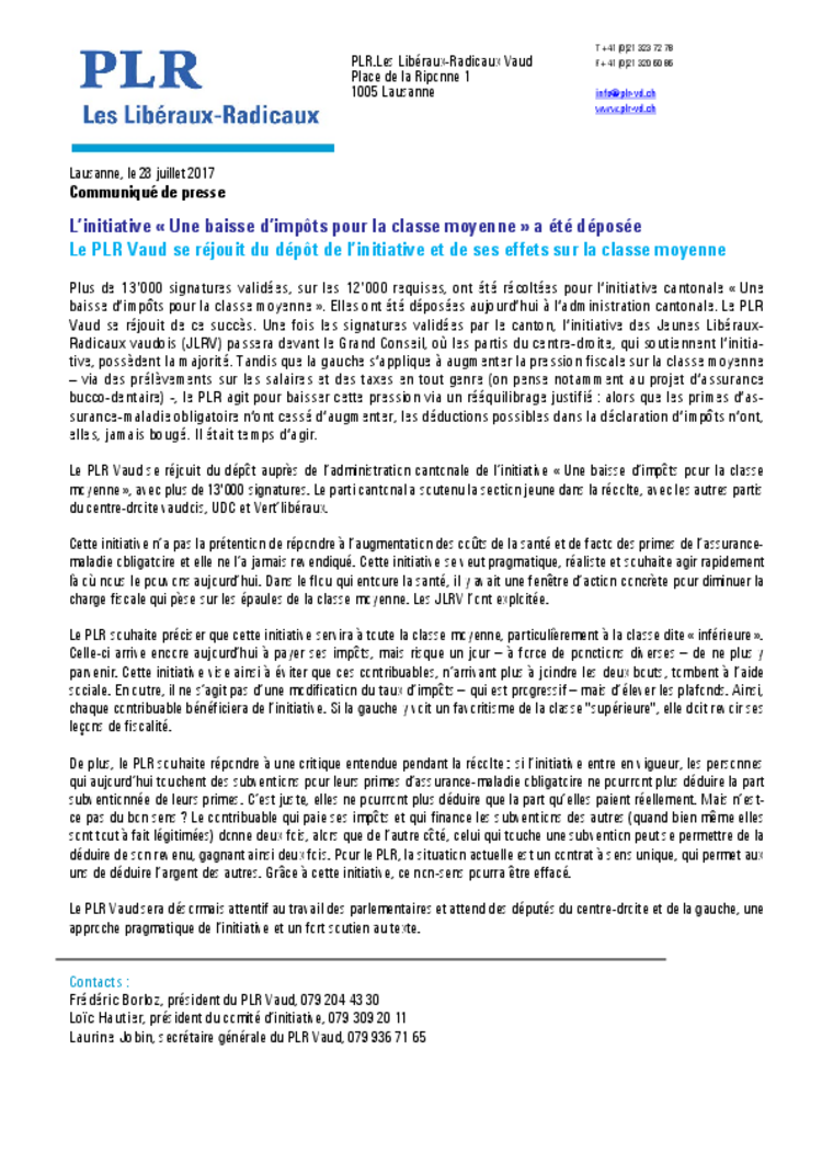 Le PLR Vaud se réjouit du dépôt auprès de l’administration cantonale de l’initiative « Une baisse d’impôts pour la classe moyenne », avec plus de 13'000 signatures. Le parti cantonal a soutenu la section jeune dans la récolte, avec les autres partis du centre-droite vaudois, UDC et Vert’libéraux.